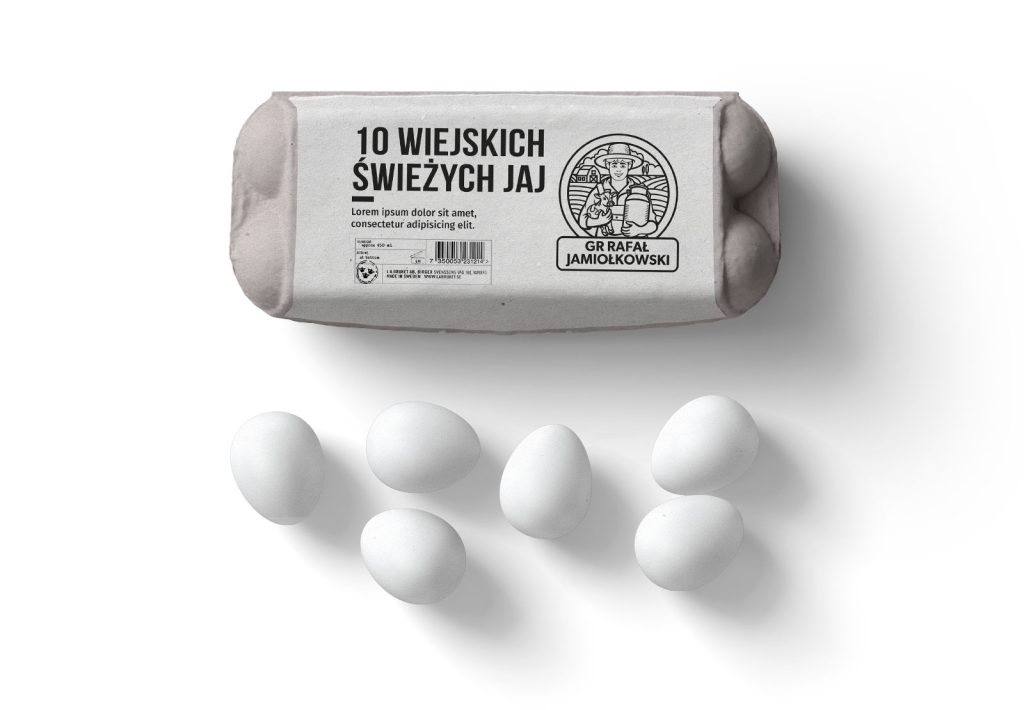 Postać rolnika: Centralnym punktem jest uśmiechnięta postać gospodarza. To zabieg humanizujący markę – pokazuje, że za produktem stoi konkretny człowiek i jego praca.